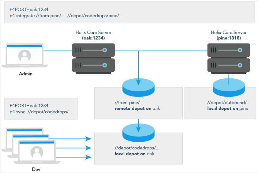 oak:1234configures a remote depot called//from-pineon theoakserver. This remote depot contains aMap:field that directs theoakserver to the//depot/outboundarea ofpine:1818. - Upon notification of the release’s availability, a build or release