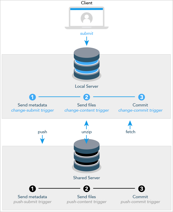 p4 push,p4 fetch, orp4 unzip) are bidirectional; depending on the command that causes the trigger to execute, either the local server or the shared server might play the role of client. - During the first phase of a push, metadata is read into memory, which